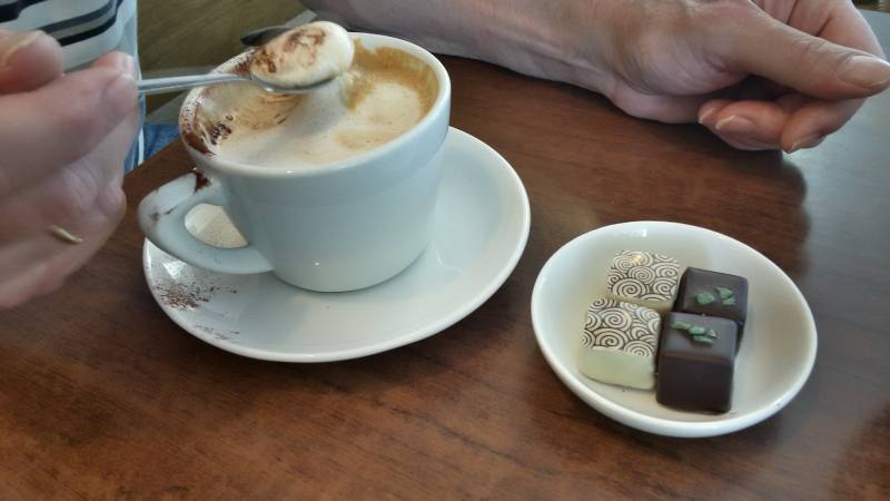 Es gibt hier Unmengen an selbst gemachten Pralinen und Trüffeln, sogar handsigniert! Eine Handvoll Trüffel und einen Kaffee und die Welt ist in Ordnung.